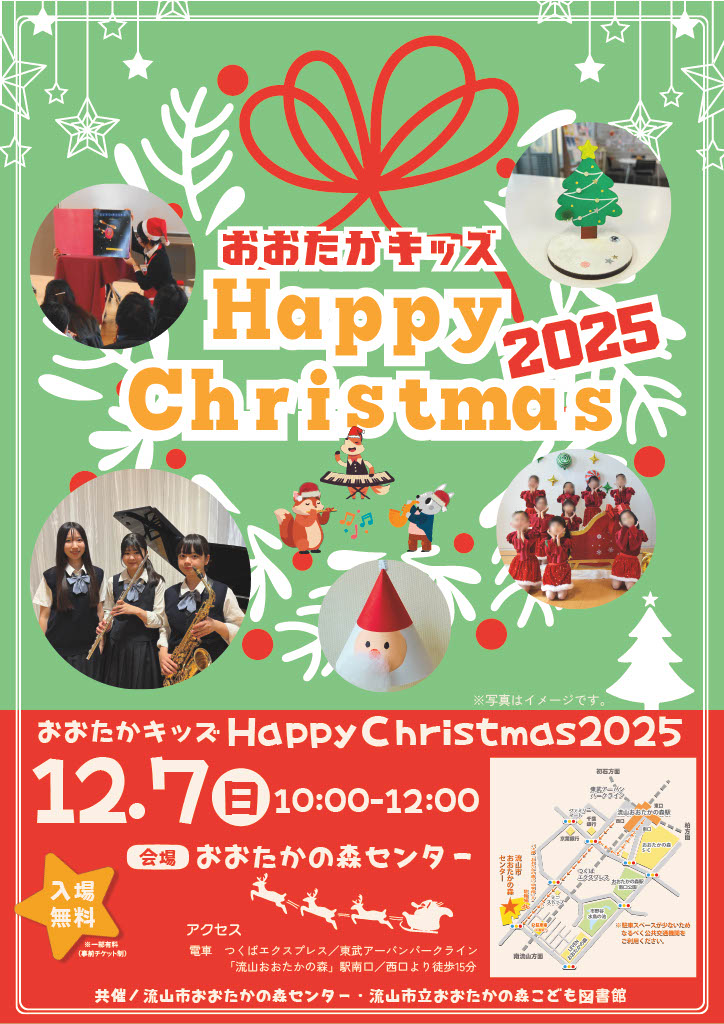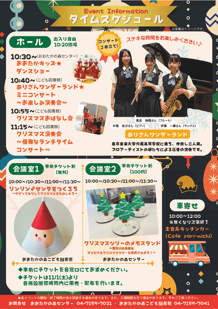 おおたかキッズ★ダンシングチームのダンスショー、クリスマスおはなし会、高校生によるクリスマスコンサート、クリスマス工作(クリスマスツリーのメモスタンド、リンリン★サンタをつくろう)を行います。キッチンカーも出店します。